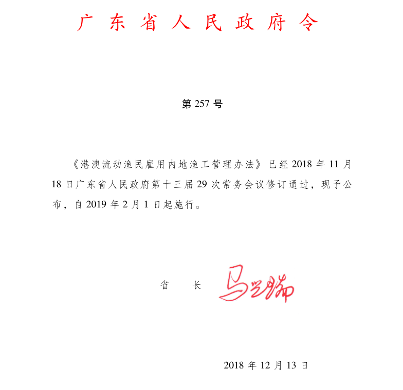 第十四条 本办法自2019年2月1日起施行。广东省人民政府1995年5月22日颁布的《粤港澳流动渔民雇用境内渔工管理办法》(粤府〔1995〕40号)同时废止。